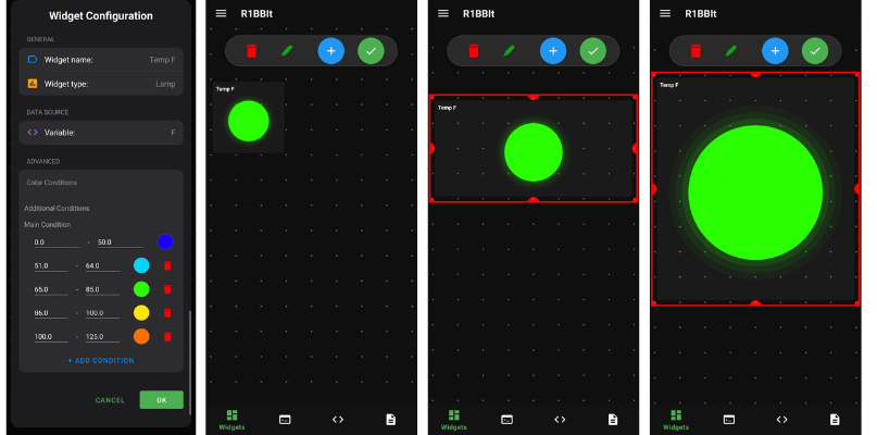 Lamp – Displays a color indicator of adjustable size, where the color depends on the user variable range.