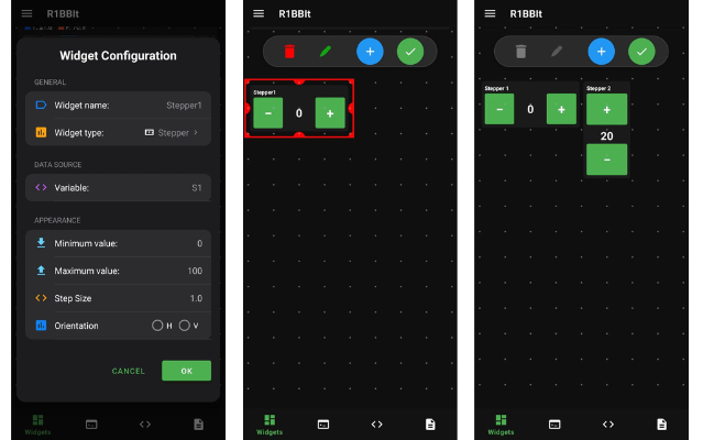 The Stepper widget lets users input a numeric value and send it to the program through a selected variable. You can define a custom minimum and maximum range, as well as the step size for increasing or decreasing the value. Pressing and holding the + or buttons will rapidly adjust the value within the specified range, making precise and fast control easy.