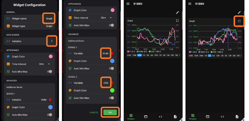 The Graph widget is the most advanced and powerful widget available. It allows you to display one or multiple variables on a single graph, with individual colors assigned to each data series. Each variable is shown using its own scale, making the graphs clear, readable, and easy to interpret.