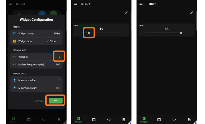The Slider widget allows the user to set a value that is sent to the script via a specified variable for further processing.