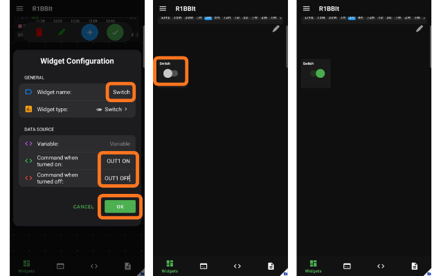 Unlike the Switch widget, the Button offers additional operating modes: Toggle and Push.